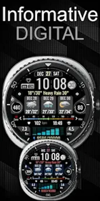 사용자 정의는 정보 제공 디지털 날씨 A4의 주요 기능으로, 사용자가 10개 이상의 시간 색상 옵션과 3개의 배경 색상으로 시계 페이스를 개인화할 수 있습니다. 이 앱은 심박수 측정 및 캘린더와 같은 기능에 쉽게 접근할 수 있게 하여 사용자 경험을 향상시킵니다. 포괄적인 기능과 사용자 정의 옵션을 갖춘 이 시계 페이스는 기능성과 스타일을 모두 추구하는 Wear OS 스마트워치 사용자에게 이상적입니다.